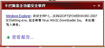 1.每打开一个包含有exe文件的文件夹,譬如金山词霸程序目录,卡巴必然会弹出如下的对话框