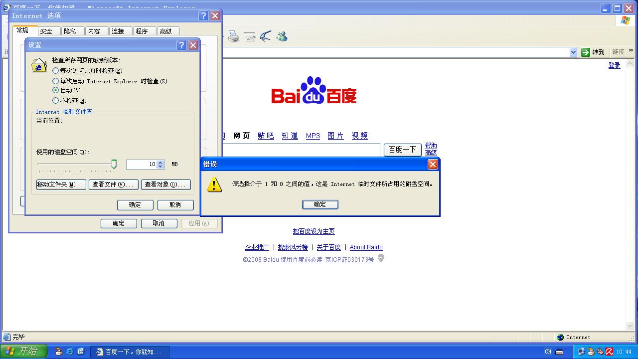 今天开机之后,双击IE比往常反映迟滞许多(等了好久IE才跳出来),网速倒没变动。等输入一个网址时,发现地址栏本应自动保存的历史记录没了,登陆论坛时,发现记录账号密码的cookie也没了,打开Temporary Internet Files一看,里面空空的,但是属性却显示有23M的大小。于是我打开IE--工具--INTERNET选项--临时文件夹——设置,发现internet临时文件所占用的磁盘空间居然为零,而且一旦改动它的大小就会跳出这样的消息框:
