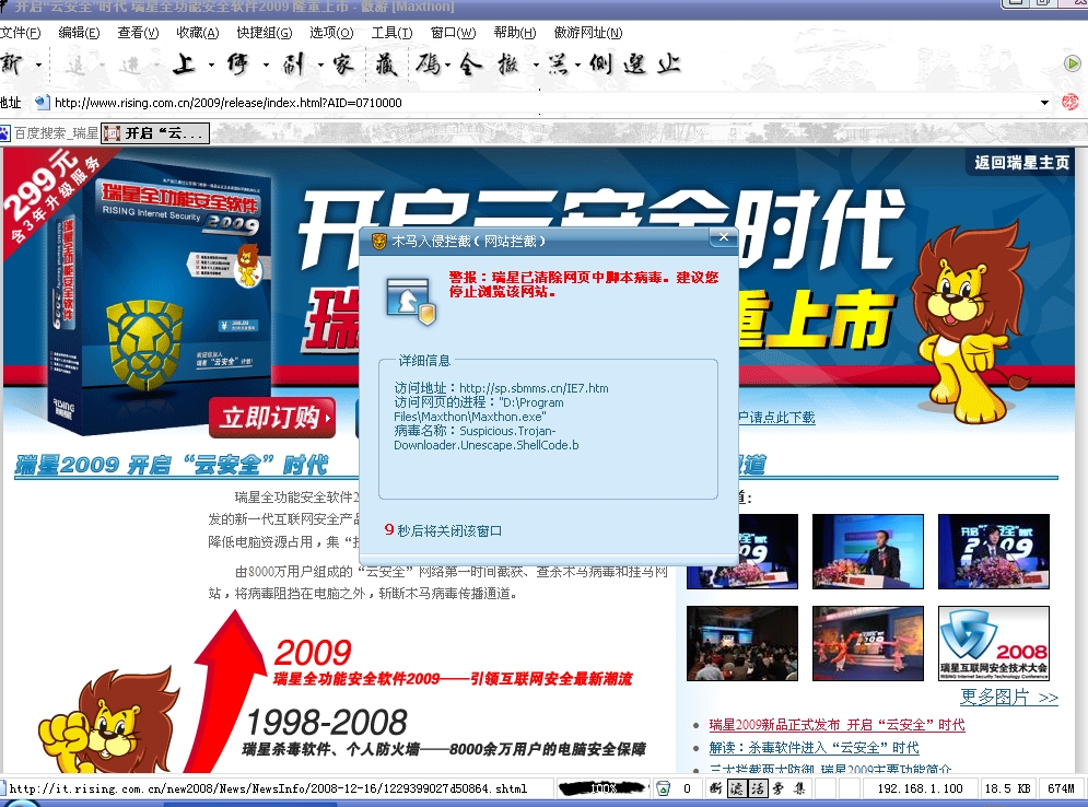 瑞星的工程师在那里啊!早上起来就没有这个现象了!我晕死了哦!到底是不是病毒啊!给个说法哦!我的电脑昨晚一夜未关,开机下载东西,用瑞星2009杀毒提示没有病毒,用360扫描也没有!但是莫名其妙现在就好了!