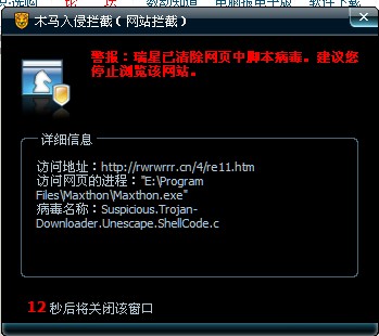 该漏洞存在于系统关键文件user32.dll中。当进入带有相关恶意代码的网页时,浏览器将会把这种畸形ANI文件下载到本机临时文件夹中,并依照网页脚本执行,将其设置为浏览此页面时鼠标的光标图案。在有瑞星监控的电脑上,当打开带有相关恶意代码的网页,将畸形ANI文件下载到本机临时文件夹中时,瑞星监控将报警,提示发现脚本病毒或网页木马。如果该文件在被下载到临时文件夹时即被瑞星查出,一般处理结果为“清除成功”,而如果该文件在被浏览器调用过程中被发现,瑞星一般将跳过相关代码并提示用户必须“重启电脑后删除文件”。无论是哪种情况,此畸形ANI文件都将不起作用,也就不会下载真正的病毒木马了。
