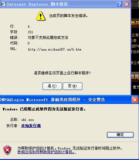 前2天也就是3月8号 我们在玩DNF(地下城与勇士)的时候老是会弹出一个阻止程序的消息框 名字就是OK1.exe 然后瑞星会有提示说 已阻止程序从 aaa.michael67.cn/b.htm下载一个脚本 图片在附件