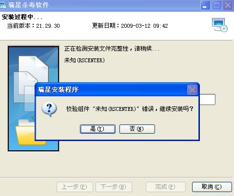 我的瑞星杀毒软件2009这几天突然打不开,点图标都没有用,而且还显黄色雨伞 安全模式下进入控制面版想要卸载但是它却提示我安装的程序,接着点下去会出现这种情况接下来都是一步一步来的!
