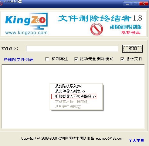 使用说明:(先勾选抑制再生)删除时复制所有要删除文件的路径,在待删除文件列表里点击右键选择从剪贴板导入,导入后在要删除文件上点击右键,(在待删除文件列表里点击右键选择从剪贴板导入不检查路径,)选择立刻重启删除,电脑会重启进入DOS界面进行删除操作。运行xdelbox前最好卸载所有可移动存储介质(包括U盘,MP3,手机存储卡等)。