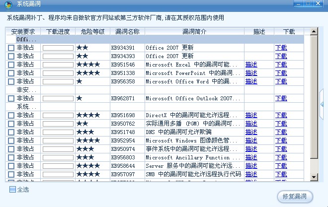 各位大虾,我这电脑是什么毛病啊。我正在看书呢,瑞星消息就告诉我,系统存在16个漏洞。我一查看就这些。我把这些都下载了(如下图)。然后安装,安装完重新启动后,瑞星告诉我还是有16个漏洞,我该怎么办啊????????????? 跪谢(我哪次一中病毒,就找人从做系统,我这个月是第3次了。做一次50,有点吃不消了。谢谢各位大虾)