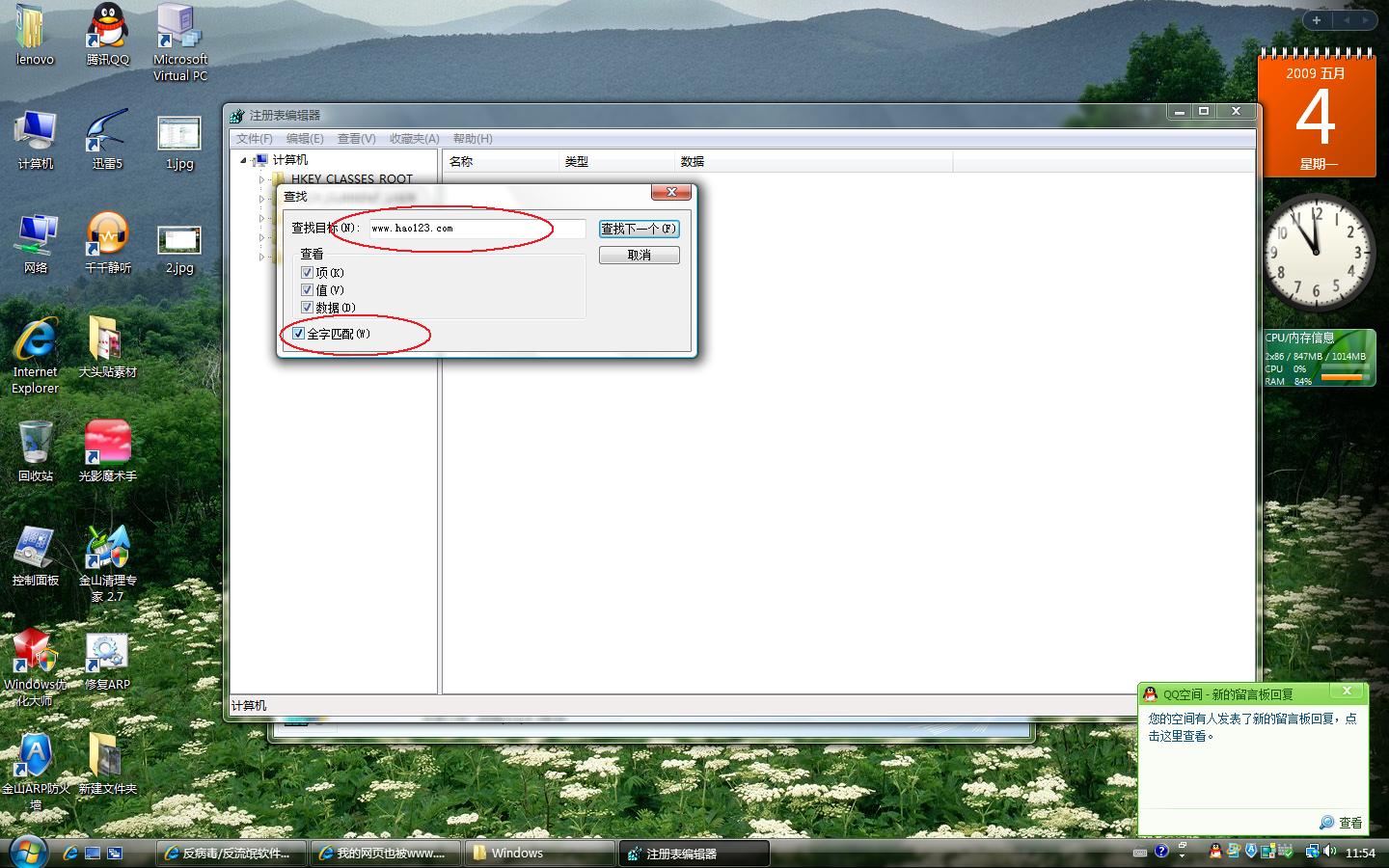 从五一就中毒了,三四天也没清除掉,特别讨厌的网站 我用了卡卡、360、WINDOWS清理工具、超级兔子,都没有用,救命吧