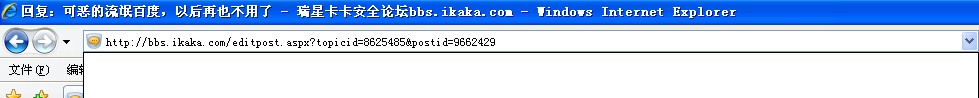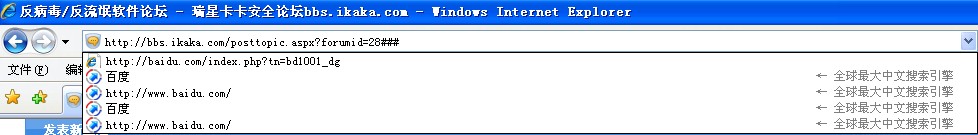 今天打开IE7,用百度搜索了一些资料,IE的地址栏就被百度恶意植入了链接,IE工具清除、注册表清除都清除不了(瑞星检测正常),而且随清除的次数,百度的地址是越来越多,昏迷啊!可恶的流氓百度~~~~~,求救!!!!!!!