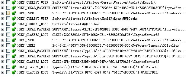 今天无意点错了QQ文件夹里的文件,就是那个QQ工具条,安装上了,无意安装的嘛,随后立刻给卸载了,然后用360,windows清理助手,金山清理专家,扫描都发现QQ工具条怎么删也删不了,然后在百度上找了各种方法也不行,用优化大师删除注册表删除不了,冰刃也不行,去了安全模式下去删除也不行,用360,清理助手,金山,删除重启还有,然后去注册表找到这东西删除还是不行