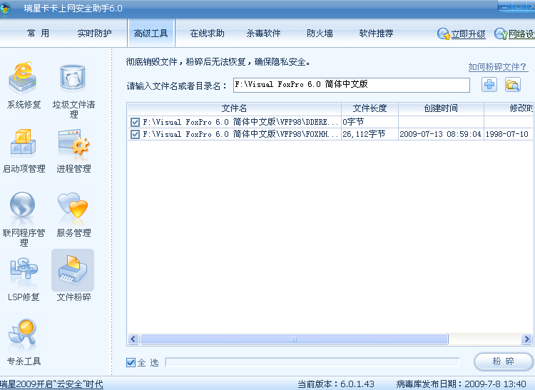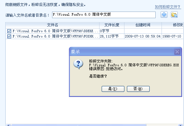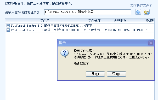 我今天下载了一个VFP,发现没法用就删,结果删不掉一些文件,我打算粉碎,可是出现异样了