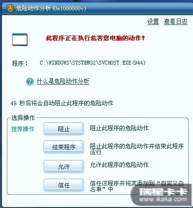 从昨天开始,开任何软件,都会跳出来这个提示,,危险动作分析,显示此程序正在执行危害您电脑的动作,程序为C:\WINDOWS\SYSTEM32\SVCHOST.EXE(944),用瑞星杀了毒,昨天杀了几个毒后,今天还是照样出现,再杀毒,没杀出毒。。用卡卡查了下木马,没发现木马,我只有一次次地点阻止。后面我一键还原了。。把瑞星升级到26号的病毒库为21.53.00.00的版本。。。后面瑞星自动升级到27号的瑞星病毒库为22.19.01.08版本时,又再次出现了这个问题。后面我就把瑞星卸载,重新装到26号病毒库为21.53.00.00的版本,就没出现问题了。现在我不敢轻易升级瑞星了,这到底是瑞星软件的问题,还是我的电脑有问题。请解决一下,谢谢~