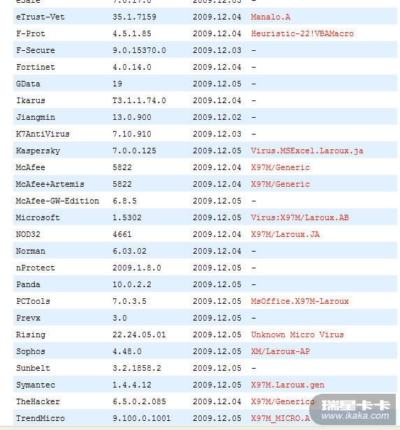 这是我在VirusTotal 上搜索的结果,可是我机子上的瑞星怎么查不出来呀,给被人发邮件老是说我发的邮件有毒,是什么excel宏病毒,有什么办法能解决呀?