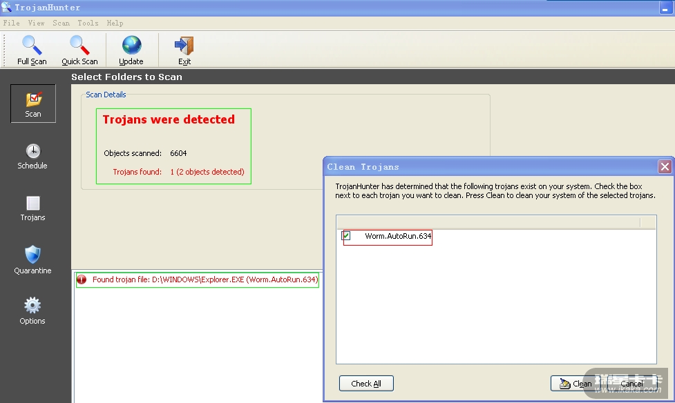 用瑞星、Windows清理助手没有查出, 使用TrojanHunter5.3查出并清理后桌面图标都没有,重启后病毒又被复制.
