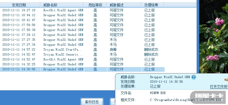 回复: win7 系统,病毒跑到了瑞星目录,日志如下,请高手看看