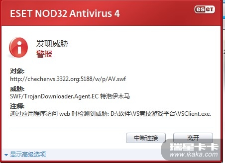 刚才我在VS对战平台上进魔兽争霸3真三国无双的房间的时候,当时我进的那个房间满了,这时VS会弹出一个房间满的提示框,同时这个提示框上也会有个小广告,结果就在弹出这个提示框的同时我的NOD 32报毒拦截了,而且当时的提示框中的广告没成功显示,显示的是空白(应该是NOD 32拦截的缘故吧),但是我的金山卫士并没有报毒!