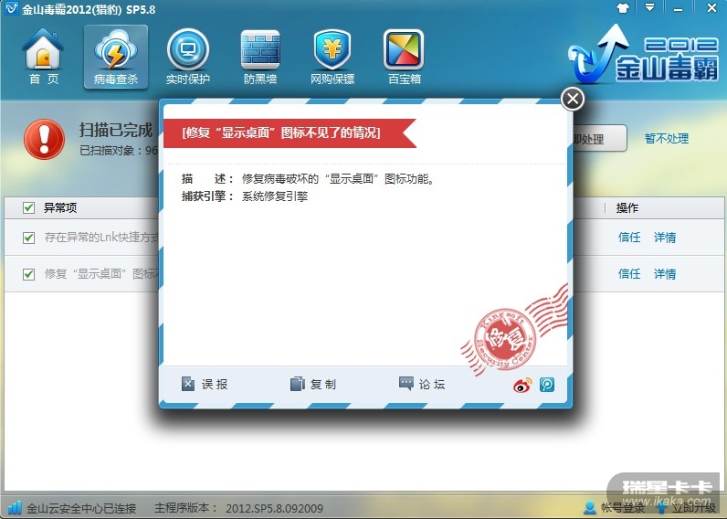 点击“开始→运行”,在弹出的“运行”对话框中输入“REGSVR32 /n /i:u shell32”(不含双引号),然后回车,片刻后会弹出“shell32中的DllInstall成功”对话框,“显示桌面”按钮即可恢复。