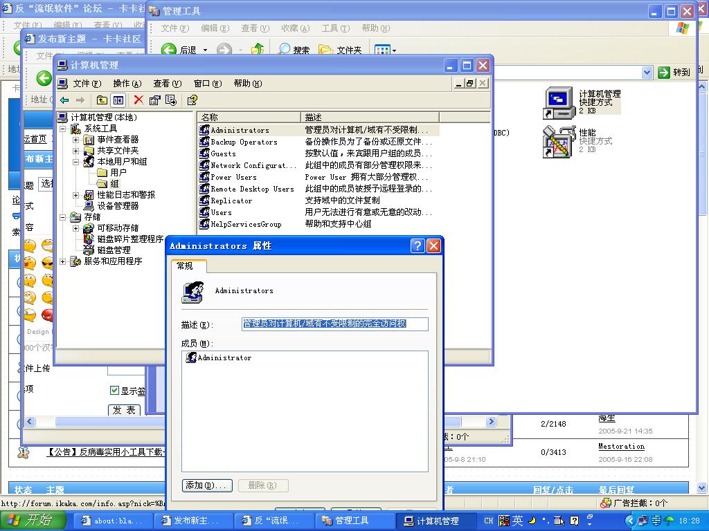 1、在管理员账户下打开控制面板,打开管理工具,打开计算机管理,在左窗格打开本地用户和组,单击"组”,然后在右窗格双击administrator,点添加,把现在的普通用户名字添加进去,点确定退出如图: