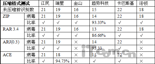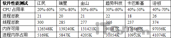 本次评测主要从产品性能测试和产品查毒测试两大部分,产品性能测试主要包括CPU 占用率、 进程总数、耗用内存数、磁盘空间占用四个方面,而查毒测试主要对流行病毒和加壳病毒的查杀数量进行比较。经过评测人员严格评测,江民杀毒软件在以上各个方面均表现突出,综合性能最佳,最终被授予本次评测的最佳性能奖。(图为6款主流杀毒软件联合评测性能对比表)