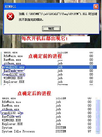 【落霞孤骛的贴子】我最近不知道是谢载软件还是杀毒的原因,每次开机的时候,总是出现RUNDLL错误!我用超级兔子,卡卡,也用瑞星杀过毒,但是这个问题一直存在!那位大侠能帮我看看是怎么回事啊?
