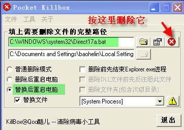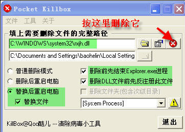 一、用KillBox删除木马文件(见图1、图2)。