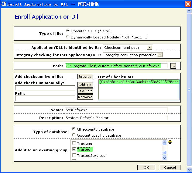 5、至于图1所示的TPF2005报警问题,比较容易解决——将SSM2.0.0558的主程序收入“Trusted”组即可(图5)。别忘了SSM2.0.0558的主程序要选择MD5+路径的双重完整性保护。