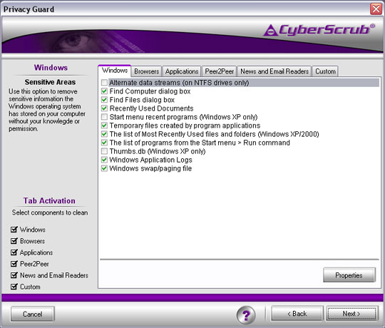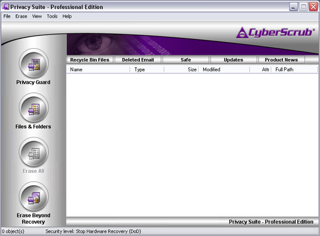 CyberScrub Privacy Suite (formerly known as CyberScrub Professional Edition) is a high level military grade security application designed to help you completely eliminate sensitive information from your computer, protect your Internet privacy, and enhance system performance. Delete All Evidence of Online Activity, Secure Data with Powerful Encryption, Erase Previously "Deleted" Files, Destroys Email, P2P Tracks.