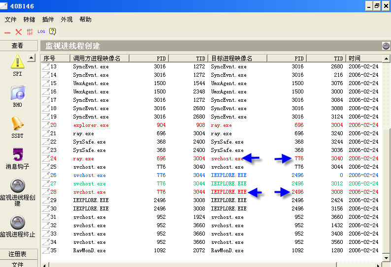 这个木马的一个特点是:那个d1l文件除了插入IE进程外,还插入一个svchost进程。具体是那个svchost被插入了?可以用IceSword检查。