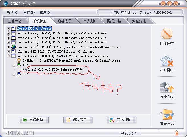 在瑞星防火墙的“系统状态”里发现这个 “TCP Local 0.0.0.0:5000[Sokets-de木马]”小弟愚昧,不晓得是什么东西,是木马病毒还是什么其它文件?大伙帮助看下,谢了。