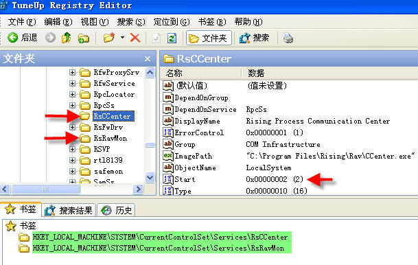 打开注册表编辑器,检查瑞星服务的两个键值(正常时start=0x00000002)