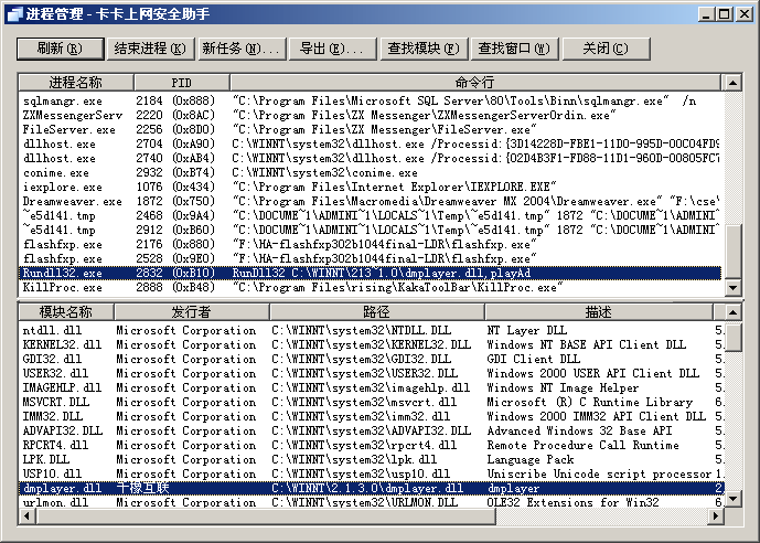 1、结束进程 ,总共两个,这两个进程通过卡卡安全助手的进程管理工具,搜索dmplayer.dll可找到,我找到两个,结束这两个进程