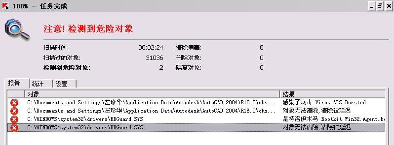 我的卡巴斯基查到我中了特洛伊木马 Rootkit.win32.Agent.bo病毒:BDGuard.SYS