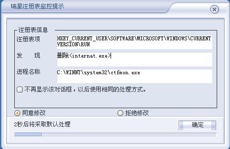 大侠们帮我看看,每次开机瑞星注册表监控都会提示,必须同意修改才能上网,系统是2000的。
