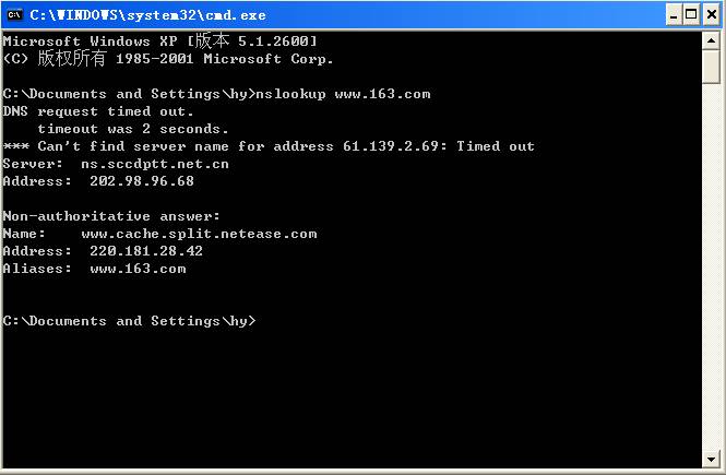 2、开始--运行--cmd 回车--在窗口中输入“nslookup www.163.com”,看看Name:那一行写着什么?nslookup后面有空格,跟着的网址请输入会弹出那个雪花广告的页面地址