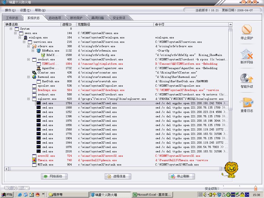 win2000 sp4系统,安了SQL2000sp3,开了系统防火墙,装了瑞星正版杀毒软件,现在电脑反应很慢,系统进程里一看,开了十几二十个CMD.EXE及FTP.EXE,杀毒软件杀不到毒,启动项里无异常程序,在系统进程里关不掉这两个进程,只有在瑞星2006防火墙里方可关掉此进程,怎么办?求高手