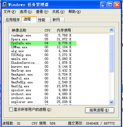联系到论坛中关于街头篮球带后门程序的帖子,感觉到非常气愤,不吐不快,于是我就去了他们的官方论坛,把这里有关帖子的连接发了过去。同时,我还开了淘宝的页面,并打开了淘宝旺旺跟卖家联系。就在我点击页面上与卖家联系的按钮时,机器当机了。我打开任务管理器看到cpu占用率是100%,TT浏览器无响应。然后我进SSM看进程,那个占用CPU100%的进程竟然是SSM程序自身。由于我是笔记本,无奈,只好按住power键4秒强制关机然后重起。第二次,当我再次进入街头篮球和淘宝旺旺的页面的时候,也是在我操作淘宝旺旺添加好友时,机器又一次死机了,看SSM监控,占用cpu100%的还是SSM自身。