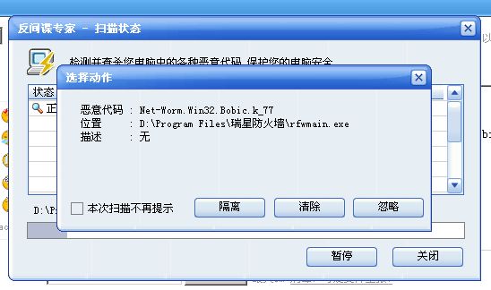 我把防火墙卸载了,重新安装瑞星防火墙2005版的,再用反间谍专家查杀,没事,但我一升级我的防火墙到最新的18.23版本,反间谍就会查出net-worm.win32.bobic.k_77这个东西