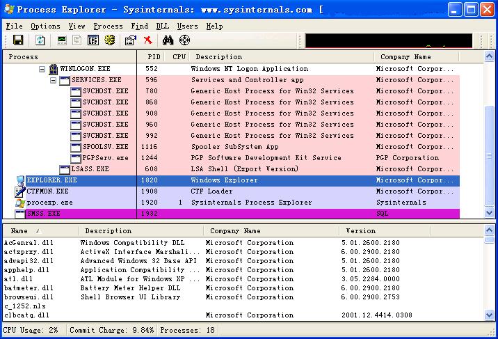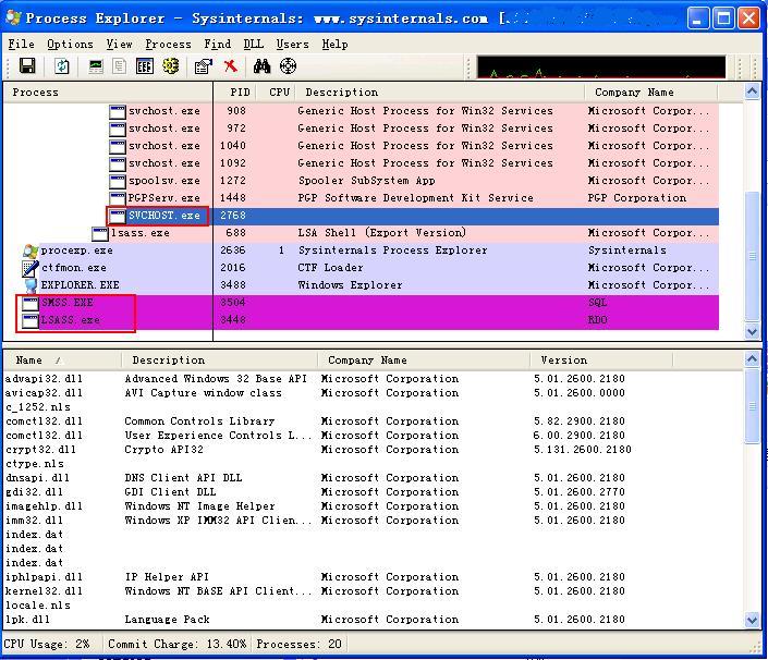 。当打开Procexp首先看到三个可疑的程序:SVCHOST,SMSS.exe,LSASS.exe,如图: