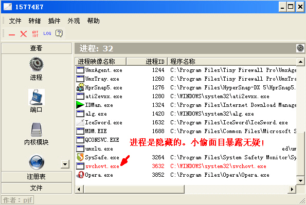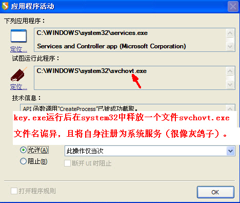 这个进程svchovt.exe很隐蔽,只是他的pid是3632!凭这一点就能够判断这个是病毒进程!! 因为正常的系统进程的pid是不会超过1300,