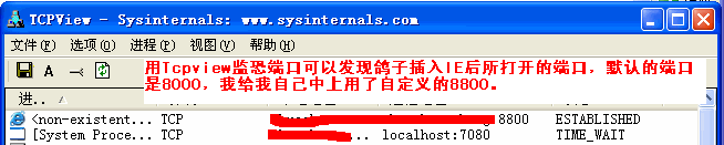 1。 使用Tcpview查看是否有可疑的IE端口打开,鸽子的默认端口为8000,但也可以自定义,一点发现有可疑端口说明你已经中后门,