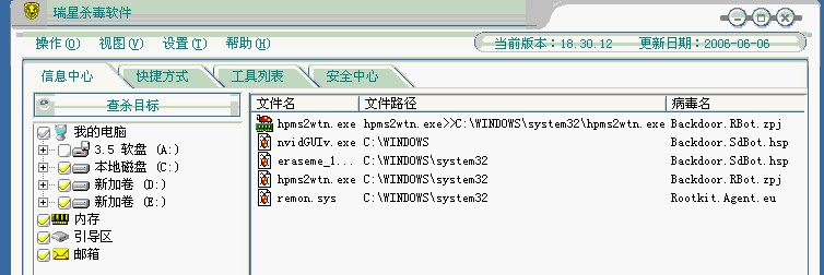 昨天给硬盘格式化,新安装了WIN2003系统+SQL2000,安装好后觉得机器有点慢,用瑞星杀毒时发现系统文件中毒了,如图