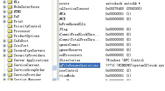 位置:驱动盘\WINDOWS\system32\vook.sys,但在WIN下或安全模式以及DOS下查找不出被控端主文件vook.sys ;在注册表中生成PendingFileRenameOperations,键值删除后,重新启动系统又会重新生成(见附件3);在系统启动项和进程表中不能发现相关的启动项目(见附件2)。