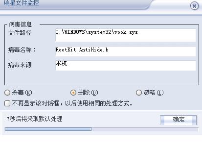 杀软监控情况:在解压后瑞星监控能及时发现(见附件1),但在“杀毒”后,提示重启系统后删除,可重新启动系统后,该木马依然存在;金山、KV和卡巴斯基以及诺顿等杀软和微软的间谍查杀程序还不能发现。