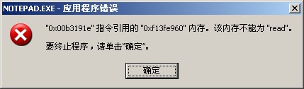 在使用动态分配的应用程序中,有时会有这样的情况出现:程序试突读写一块「应该可用」的内存,但不知为什么,这个预料中可用的光标已经失效了。有可能是「忘记了」向操作系统要求分配,也可能是程序自己在某个时候已经注销了这块内存而「没有留意」等等。注销了的内存被系统回收,其访问权已经不属于该应用程序,因此读写操作也同样会触发系统的保护机制,企图「违法」的程序唯一的下场就是被操作终止执行,回收全部资源。计算机世界的法律还是要比人类有效和严厉得多啊!像这样的情况都属于程序自身的BUG,你往往可在特定的操作顺序下重现错误。无效光标不一定总是0,因此错误提示中的内存地址也不一定为「0x00000000」,而是其它随机数字。如果系统经常有所提到的错误提示,下面的建议可能会有说明 :