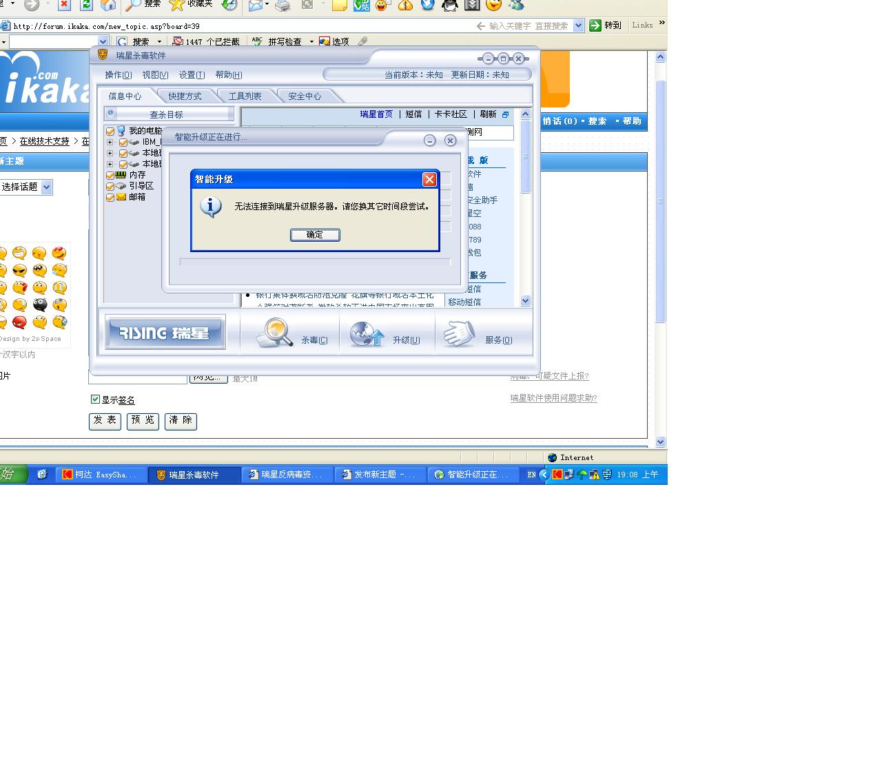瑞星自动升级时提示“无法连接到升级服务器,请换其他时间尝试”,同时,瑞星已安装的版本上总是显示当前版本未知,更新日期未知;已经有很久了,请问如何解决。