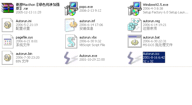 C、D、E、F四个驱动器根目录里都有autorun.inf、autorun.bat、autorun.exe、autorun.vbs等8个隐藏文件,名字都是autorun,只是后缀名不一样,删掉后会马上自动生成。