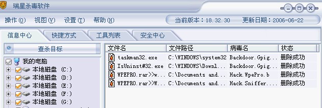 我还没关了瑞星,希望能把丢失的邮件找回来,因此,杀毒日志里没有显示呢