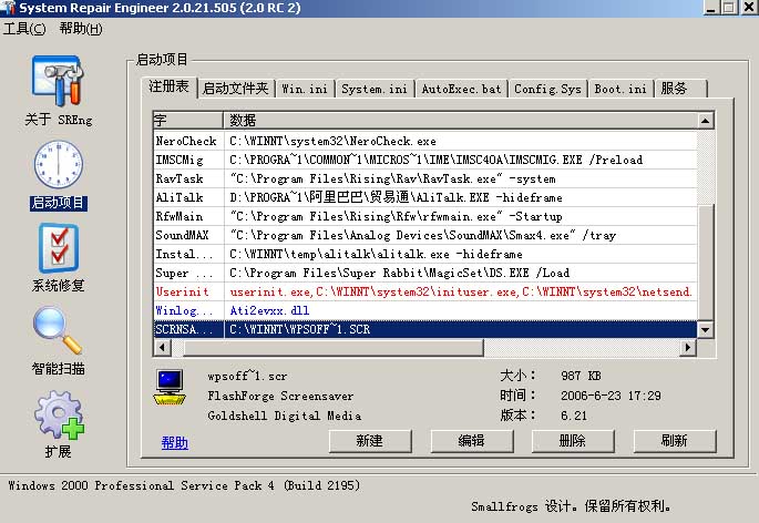 运行(双击)System Repair Engineer,使用“启动项目,注册表”选中要修复的项,