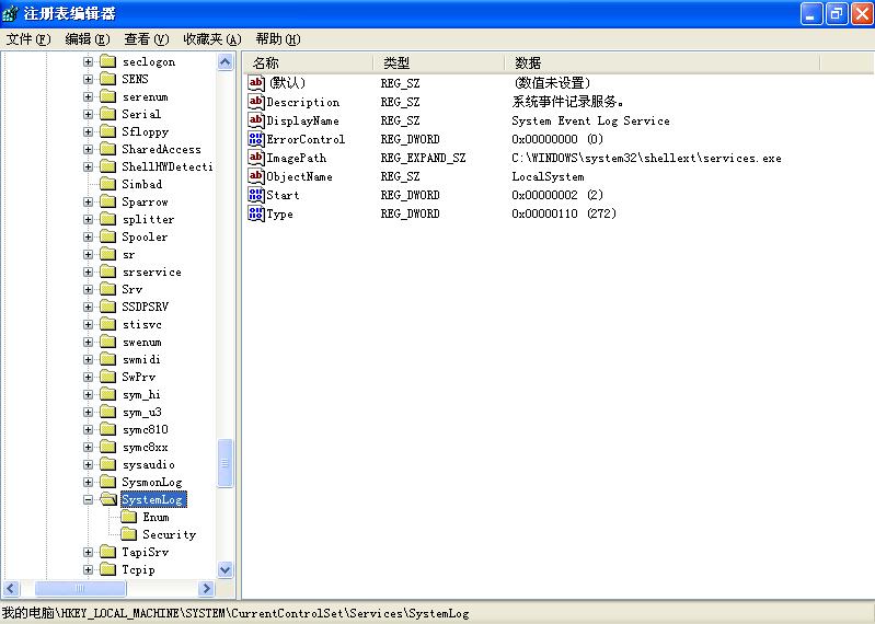 先删除[HKEY_LOCAL_MACHINE\SYSTEM\CurrentControlSet\Services]的systemLog