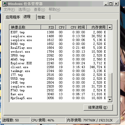 从昨天开始我进程里多了这些进程,具体请看图,就是那些.tmp的进程,基本上每30分钟-1个小时,又会生成个新的,在占用我的内存,我已经把正版瑞星升级了,依然杀不掉,请高手们帮忙看看,谢谢。
