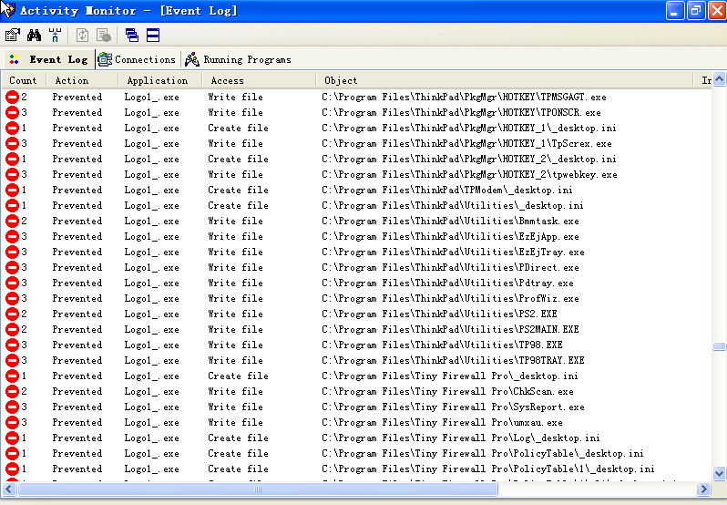 然后,运行“威金”蠕虫Logo_1.exe。用Tiny的Activity Monitor观察蠕虫的实际感染情况(图3)——所有感染步骤均被阻断!