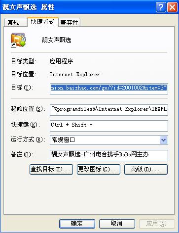 这个网址的属性,目标是:"%programfiles%\Internet Explorer\IEXPLORE.EXE" "http://union.baizhao.com/go/?id=2001002&item=3"。