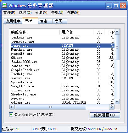 1.由于这个lexps.exe是用SYSTEM权限运行的,所以只能用IceSword强行终止它.